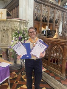 Phoebe with her certificate in Holy Trinity Church, Long Melford.